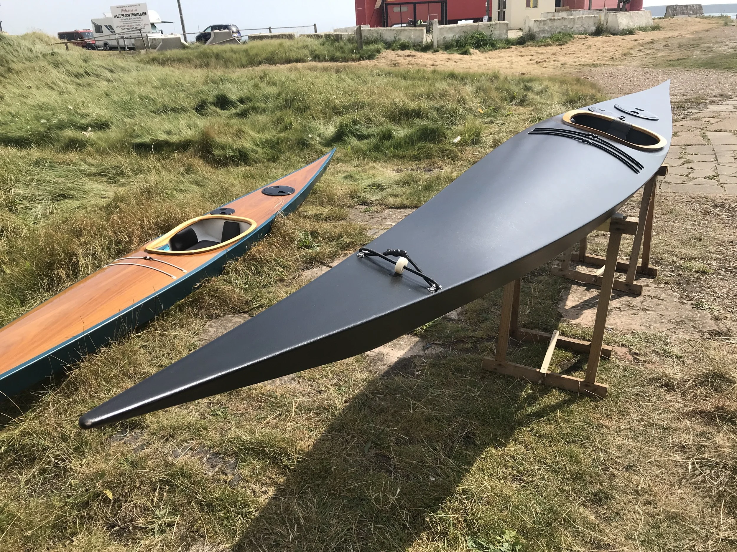 Professionally built epoxy/plywood Shrike with 2 bulkheads and a retro-fitted ‘slide on skeg’ . Comes with minicell foam seat and two hatches, one in the foot bulkhead, and one on the rear deck. This is our lightest boat at only 13.4kg. Painted in survival orange with a mid grey hull, it has some minor scratches from use. This boat would be about £2800 new