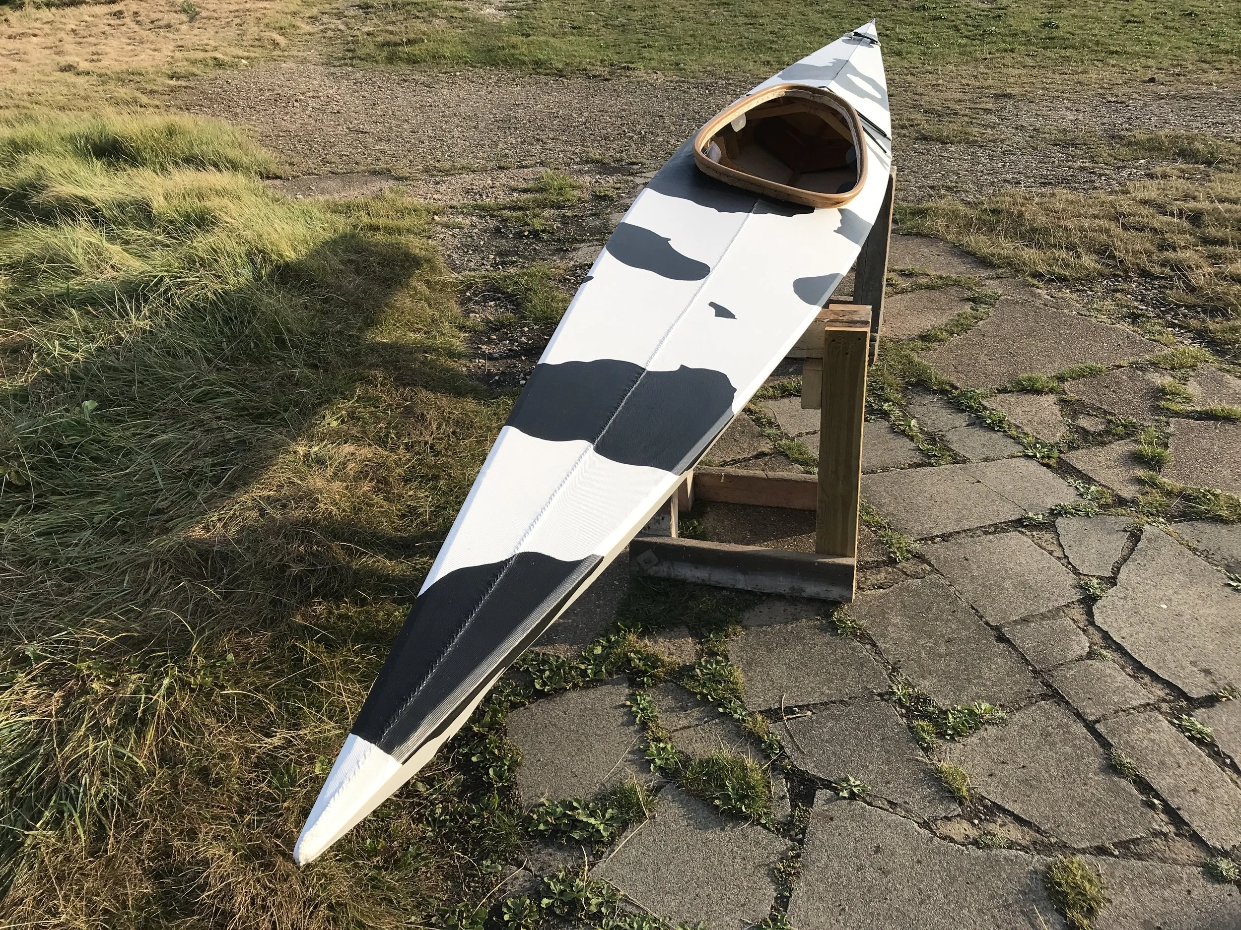 A medium weight, fast, polyester skinned, fuselage framed kayak, inspired by Greenland style boats. The Shad tracks well and sits low in the water. It has a reassuring amount of primary stability, compared to other Greenland style boats, if you’r new to paddling. The polyester fabric is sewn onto a steamed oak cockpit ring after being wrapped around the boat and sewn together along the deck using a ‘bolt rope method. There are no glue or metal fastenings on this kayak, all the wooden parts are lashed tightly together with artificial sinew or joined with wooden pegs. This boat can be re-painted with any oil or water based exterior coating. Cockpit size fits a regular keyhole skirt. The boat comes with our comfy foam seat, mounted on a lashed plywood sole-boards so your not pushing against the skin. The foot pegs are adjustable, however they could be removed from inside. You can buy more lightly skinned boats but this Shad has been made tough !