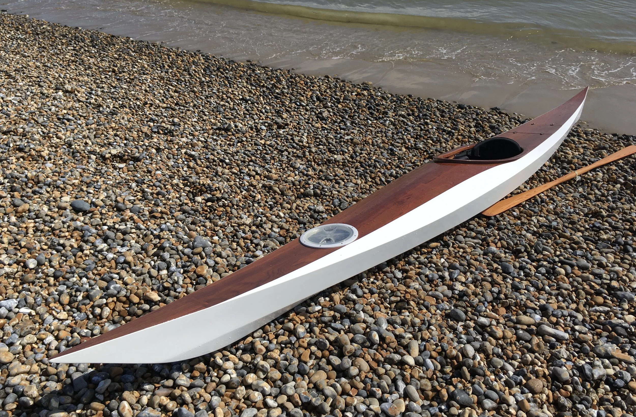 Professionally built, ex demo, epoxy/ply, single chined West Greenland inspired hull, with reassuring primary and secondary stability characteristics, this boat tracks well and edge turns o.k. with good straight line speed. A great all round kayak with 2 watertight compartments and a roomy key hole cockpit. Suitable for day paddling and moderate touring. This kayak has two watertight compartments and a flush rear deck hatch, along with extra reinforcement in key areas. It’s at the tougher end of epoxy ply construction with foam buoyancy fills, fore and aft. Adjustable foot rests and moulded foam seat with thigh pads and back pad. Deck lines can be added as required. This kayak has been heavily painted and varnished for durability but shows some signs of light use. Deck lines can be added upon request.